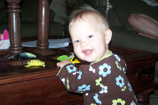 Once I started crawling, it only took me about a three days to figure how to pull up and only one more day to figure out how to get where I wanted to go when I was up. And I'm sure you can tell that I'm happy about it!!